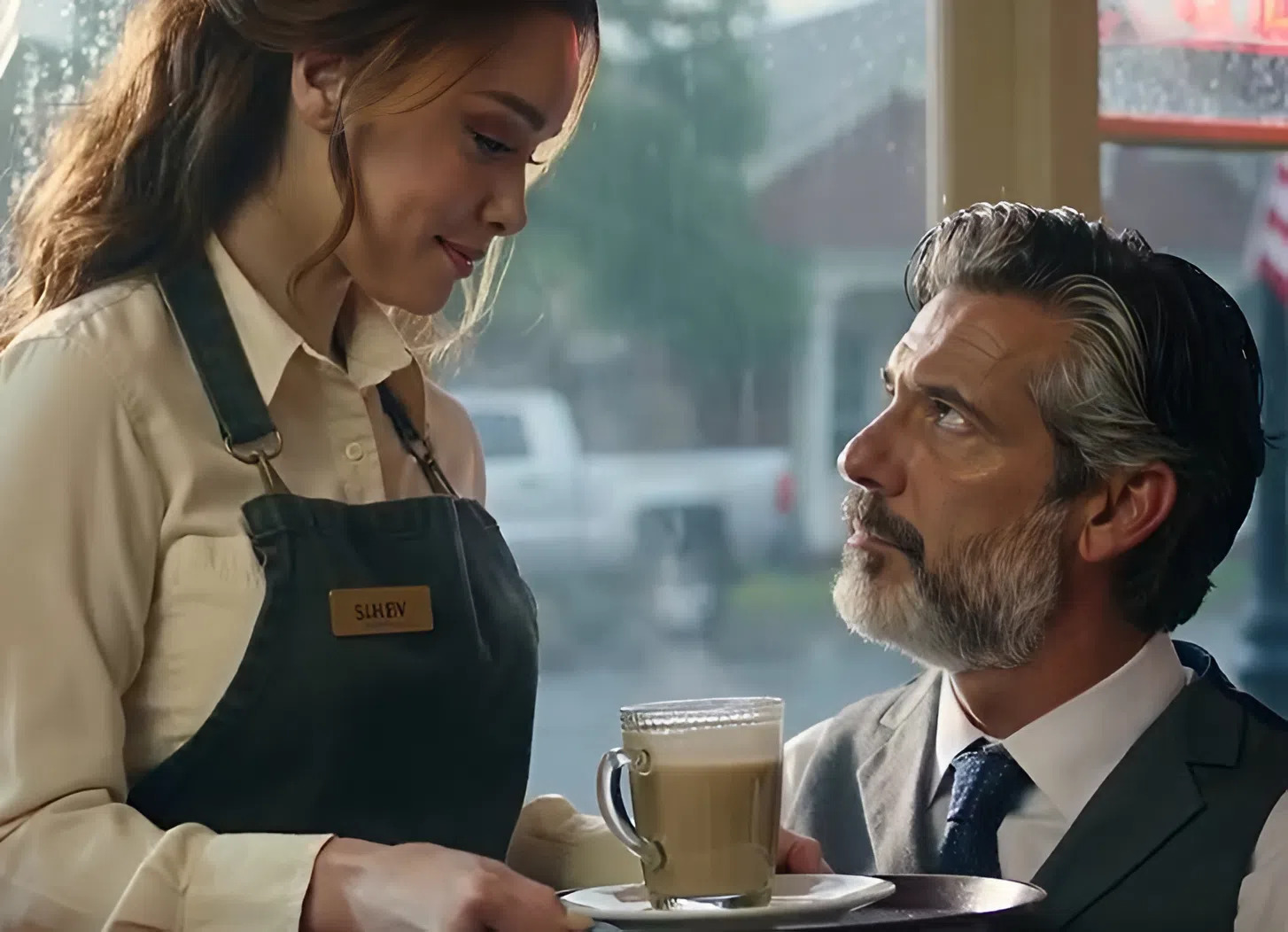 W centrum miasta przytulna kawiarnia wypełniała się porannym zgiełkiem, deszcz cicho bębnił o duże okna